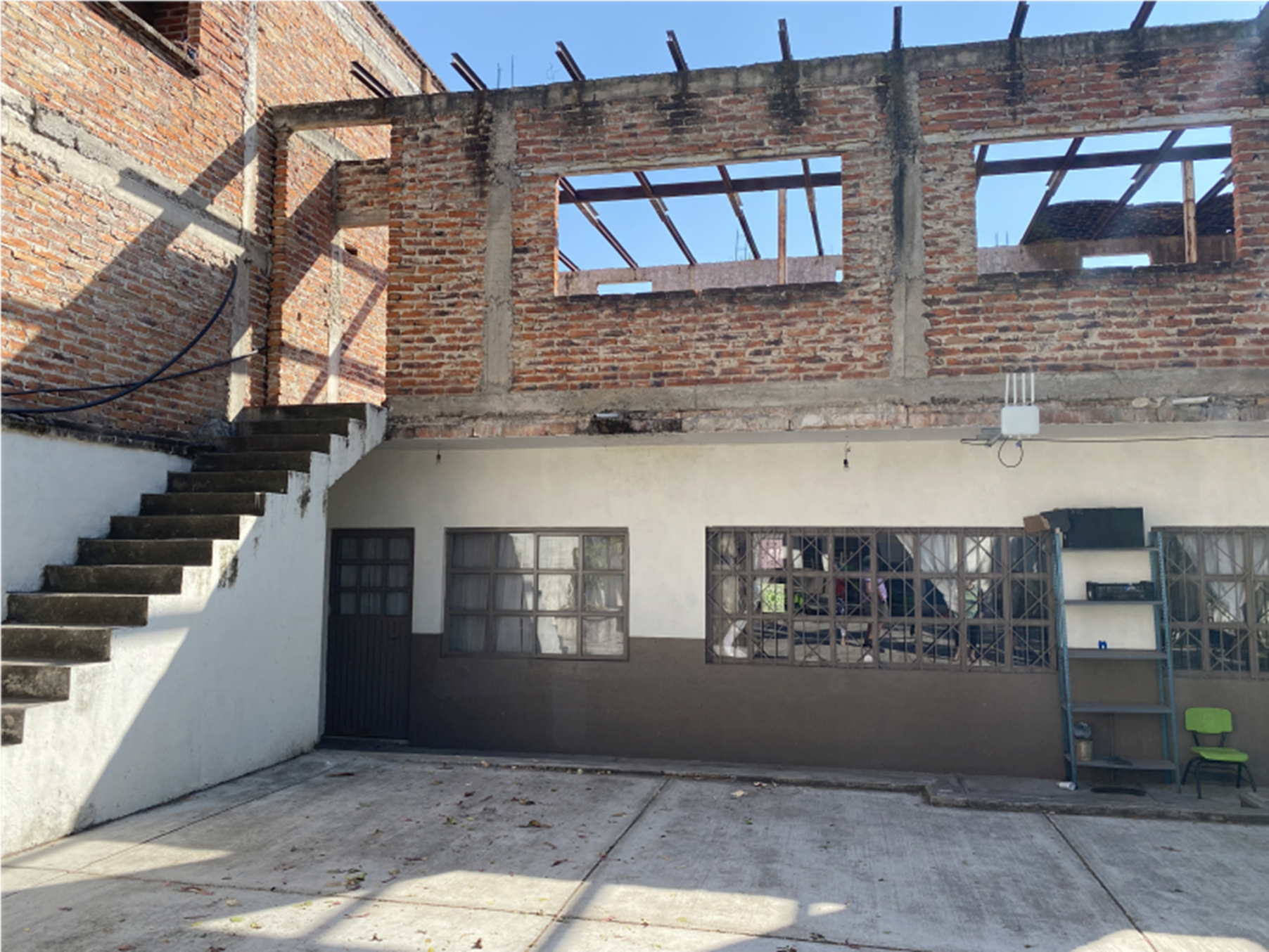 The building is in a shocking state of disrepair to the point that it is unsafe. There is a concrete stairway leading up to an unfinished classroom with no roof. The stairway has no handrails on either side and the drop from the top step is about 15 feet. This school doesn’t have money to pay a salary to an English teacher, even though it is government requirement that school children in Mexico learn English. Teachers provides their own classroom supplies. When the lightbulb burned out in the school projector it could no longer be used. The school drinking fountains haven’t worked in years. Children either bring water from home or go without. The roof leaks and some of the walls have mold growing on them. The curtains at the windows are so tattered that the classrooms cannot be darkened enough for the projector’s images to be visible.